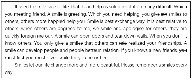 根据题目要求完成下列任务,用中文作答。 下面是某高三学生的一篇书面表达。 请结合生活中的一个事例,用英语写一篇短文,谈谈微笑的作用。