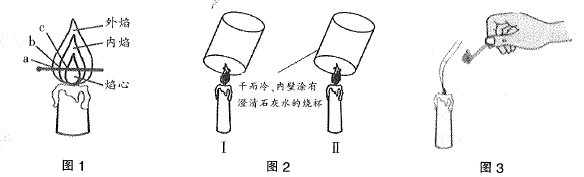 案例: 下面是某教师“蜡烛及其燃烧”的教学片断实录。 学生实验1:点燃蜡烛,取一根火柴梗,拿出一端迅速平放入火焰中(图1)约1s后取出。 老师提问1:仔细观察燃着的蜡烛,注意蜡烛燃烧时发生的什么变化?火焰分为几层?哪层最明显?哪层最暗? 学生实验2:分别取一个干燥烧杯和一个用澄清石灰水润湿内壁的烧杯,先后罩在火焰上方。(图2) 老师提问2:仔细观察烧杯壁上有什么现象发生,推测蜡烛燃烧后生成了什么物质? 学生实验3:熄灭蜡烛后,用火柴去点蜡烛刚熄灭时产生的白烟(图3)。