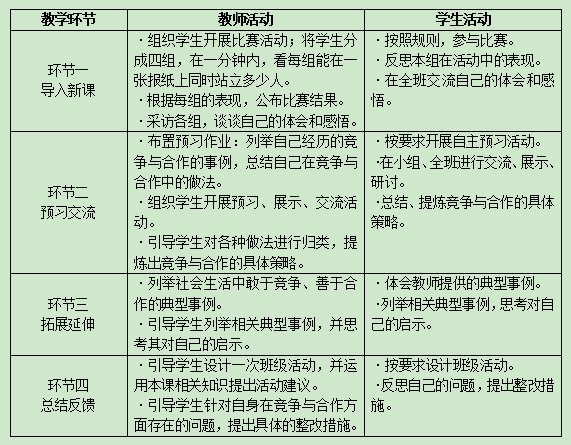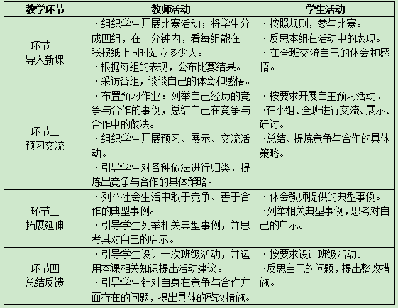 围绕思想品德“能正确对待社会生活中的竞争,敢于竞争,善于合作”的课程内容,某教师开展了如下教学活动: