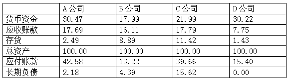 A、B、C和D是计算机行业中的著名公司,A、D公司采用先进的存货管理模式使得存货水平较低。下表为2012年的共同比资产负债表的部分数据:(%)