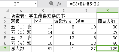 四则运算-用公式计算 在Excel的单元格中除了可以输入具体的数据外,还可以输入公式。 1.Excel的公式:在Excel中,公式是一种以“=”开头的数学计算式子,例如,“=B3+100”就是一个公式。利用公式,可以完成多种计算任务,如四则运算以及求和、求平均数等统计运算。 Excel规定用+号表示加、用-号表示减、用*号表示乘、用/号表示除。公式中只能使用小括号,小括号可以有多层。与教学中的运算顺序相同,Excel计算公式的值时也遵循先乘除、后加减,内层括号的式子优先计算等规则。 练一练:在某个单元格中输入公式:=(34+56)*0.2+35/56,再敲回车键。观察单元格中显示的数据。选定该单元格后敲Delete键,删除单元格中的内容。提示:单元格中会显示出算式(34+56)×0.2+35÷56的计算结果18.625。 2.用公式计算:如果公式中要用到其他单元格中的数据,可以在公式中输入该单元格的地址。在公式里使用单元格地址时,Excel会自动从地址对应的单元格中取出有关的值进行计算。 动手做:计算“学生读书情况”工作表中参与调查的人数。 第1步:在E3单元格中输入公式“=B3+C3+D3”后敲回车键。 第2步:在E4单元格中输入公式“=B4+C4+D4”后敲回车键。 第3步:在E5单元格中输入公式“=B5+C5+D5”后敲回车键。 第4步:在E6单元格中输入公式“=B6+C6+D6”后敲回车键。可以看到,输入公式时, 当前单元格里先显示所输入的公式,敲回车键后,公式立即变成了具体的数值。输入公式如果输错了,可以选定有错误的单元格,然后重新输入正确的。如果有错误的公式,可以利用编辑栏修改。 练一练:参照下图所示的表,在“学生读书情况”工作表的第7行中计算出参与各 类图书调查的总人教。 动手做:利用编辑栏修改公式。 第1步:选定输入了公式的单元格,如E7单元格,编辑栏的名称框里会显示出单元格地址,编辑框里会显示出输入的公式。 第2步:在编辑框里单击,框里出现插入点时,用→或←键适当移动插入点,适当修改编辑框中的公式。例如,可以把E7单元格中的公式改为“=B7+C7+D7”。 第3步:敲一下回车键或单击编辑栏里的√按钮。 小发现:实际操作时还可以看到,修改了与某个公式相关单元格中的数据后,Excel会重新计算公式的值。 动手做:改变单元格中的数据,体会Excel的自动计算功能。 第1步:选定上面工作表中的B4单元格。 第2步:把其中的数14改成19,然后敲一下回车键。可以看到,与这个数相关的E4单元格中的数值会自动从29变为34。 第3步:再杷B4单元格中的数改成14,并观察E4单元格中数的变化。 第4步:关闭工作簿文件。