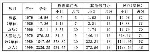 现以1979年~1989年、1989年~1999年两个10年为例做比较,分析我国各种渠道举办的幼儿园的发展梗概。见表1