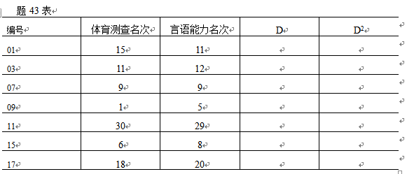 某班7名幼儿在体育测查与言语能力测查方面的排名列题43表如下。求这二者之间的等级相关系数