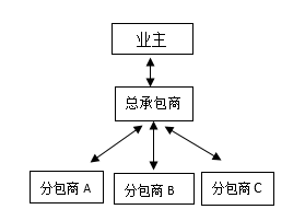项目结构图、组织结构图和合同结构图的含义不同,其表达的方式也有所不同。下图反映了一个建设项目的业主与总承包商,以及总承包商与分包商之间的某种关系,这种关系是( )