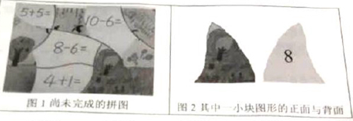 材料:教师为了帮助大班幼儿了解春天的季节特征,同时在其中渗透数学教育,专门只做了一套“春天”的拼图(如图1)。拼图底板是若干道10以内计算题,每一小块图形的正面是春天景色的一部分,背面是计算题的得数(如图2),教师希望幼儿根据计算题与得数的匹配找到拼图的相应位置。然而,材料投放后,教师却发现许多幼儿不用做计算题就能轻松完成拼图,也未对图片中的季节特征产生观察与探究的兴趣。