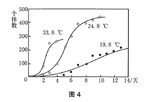 在资源和空间有限的条件下,种群数量呈“S”型增长,图4是某种藻类植物在不同温度下的种群增长曲线,下列叙述错误的是()