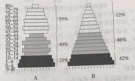 下图是A、B两个地区的人口年龄组成示意图。设A地区的人口增长率为a,B地区的人口增长率为b,那么a与b的数量关系是()。