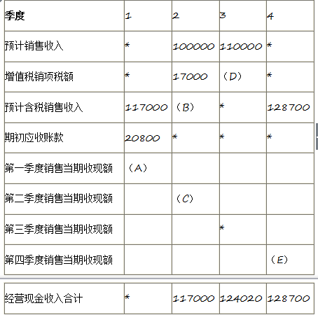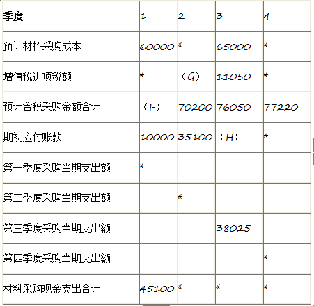 资料二:预计每个季度所需要的直接材料(含增值税)均以赊购方式采购,其中50%于本季度内支付现金,其余50%需要到下个季度付讫,假定不存在应付账款到期现金支付能力不足的问题。部分与直接材料采购预算有关的数据如表2所示: 表2 金额单位:元说明:上表中“*”表示省略的数据。