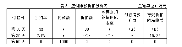 丙商场季节性采购一批商品,供应商报价为1000万元。付款条件为“3/10,2.5/30,N/90”。目前丙商场资金紧张,预计到第90天才有资金用于支付,若要在90天内付款只能通过借款解决,银行借款年利率为6%。假定一年按360天计算。有关情况如表3所示: