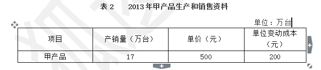 戊公司只生产销售甲产品,该产品全年产销量一致。2013年固定成本总额为4800万元,该产品生产资料如表2所示: