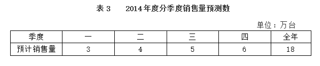 经过公司管理层讨论,公司2014年目标利润总额为600万元(不考虑所得税)。假设甲产品单价和成本性态不变。为了实现利润目标,根据销售预测,对甲产品2014年四个季度的销售量做出如下预计,见表3。 表3 2014年度分季度销售量预测数