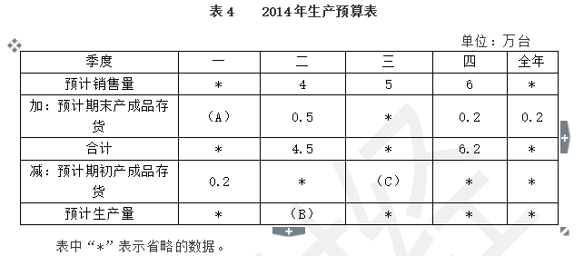 若每季度末预计的产成品存货占下个季度预计销售量的10%,2014年年末预计的产成品存货数为0.2万台。各季预计的期初存货为上季末期末存货。2013年第四季度的期末存货为0.2万台。根据以上资料,戊公司生产预算如表4所示: 表4 2014年生产预算表