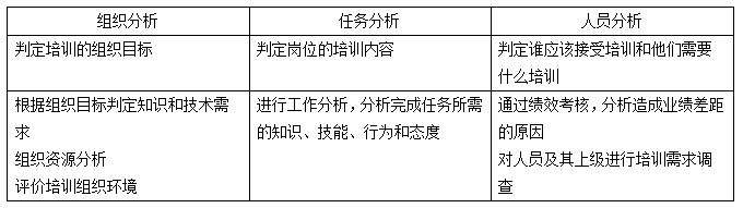 根据麦吉和塞耶的模型,培训需求分析可从组织战略、任务、个人三个层面进行。