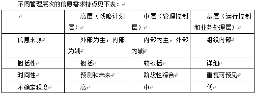 由于管理层次的构成和目的不同,每个层次的信息需求也不同,下列各项中,对不同管理层次信息需求特点表述正确的是( )。