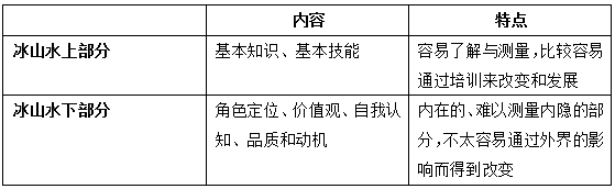 所谓冰山模型,就是将人员素质的不同表现形式划分为表面的“冰山水上部分”和深藏的“冰山水下部分”。