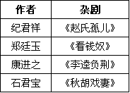 纪君祥《赵氏孤儿》、郑廷玉《李逵负荆》、康进之《看钱奴》、石君宝《秋胡戏妻》