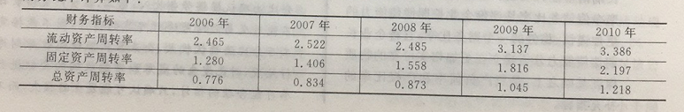 从表中可以发现:在2006~2010年间公司总体的营运能力是稳步上升。尽管2008年流动资产周转率较之2007年有所降低,但是被固定资产周转率的上升所弥补,总资产周转率仍呈上升趋势,说明公司的资产利用效率在上升。