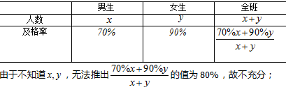 当条件(1)和条件(2)单独都不充分时,要把条件(1)和条件(2)联合起来看:容易看出不知道x和y,再加上平均分还有得不到及格率为80%的结论,故联合条件(1),(2)也不成立。