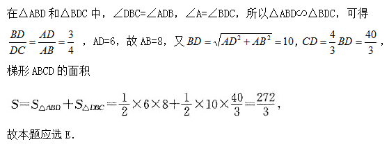 如图,在直角梯形ABCD中,AD∥BC,∠A=90°,BD⊥CD.若AD=6,BD/DC=3/4 ,则梯形ABCD的面积为( )