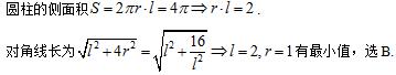 已知圆柱的侧面积为4π,则当轴截面的对角线长取最小值时,圆柱的母线长l与底半径的r值是( )。