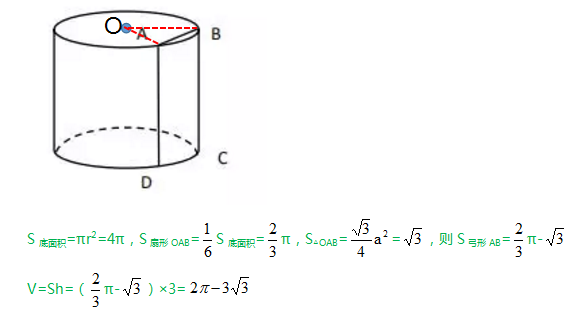 如图圆柱体的底面积半径为2,高为3,垂直于底面的平面截圆柱体所得截面为矩形ABCD。若弦AB所对的圆心角是1/3π,则截掉部分(较小部分)的体积为( )