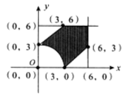 中去掉左上角和右下角两个边长为3的等腰直角三角形及左下角以原点为圆心,3为半径的直角扇形之后剩下的图形,因此它的面积为