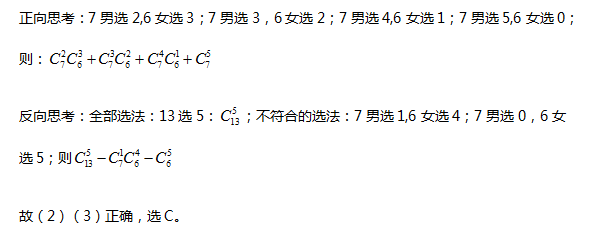 有13名医生,其中女医生6人。从中抽调5名医生组成医疗小组前往地震灾区,若医疗小组至少有2名男医生,同时至多有3名女医生,设不同的选派方法种数为n,则下列等式,其中能成为n的算式有( )个。