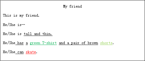 e.g. This is Tom. He is my friend. He is tall and thin. He has a green T-shirt and a pair of brown shorts. He can skate.