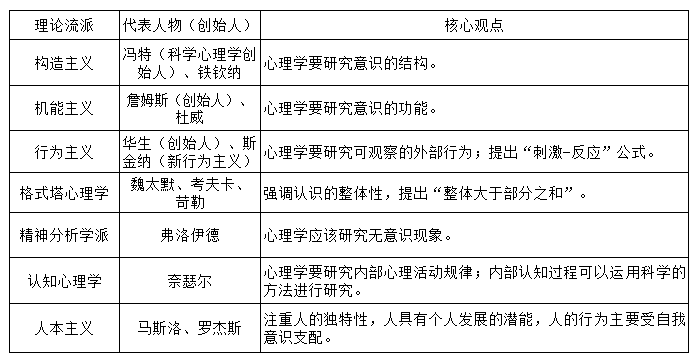 几种主要的心理学流派的代表人物和核心观点如下表所示,答题时答出四个流派即可。
