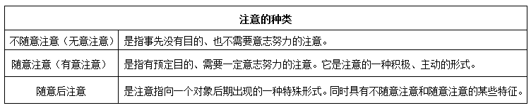 本题考查了不随意注意的含义,要与随意注意和随意后注意相区分。几种注意的含义如下表所示: