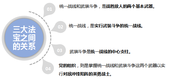 “三大法宝”是统一战线、武装斗争和党的建设。新民主主义革命三大法宝之间的关系可以结合下图记忆。