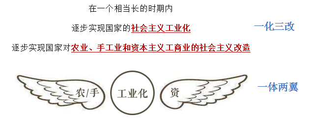 党在过渡时期总路线的主要内容被概括为“一化三改”。“一化”即社会主义工业化,“三改”即对个体农业、手工业和资本主义工商业的社会主义改造。它们之间相互联系,不可分离,可以比喻为鸟的“主体”和“两翼”。其中,“一化”是“主体”,“三改”是“两翼”,两者相辅相成、相互促进。可以结合下图理解党在过渡时期的总路线。