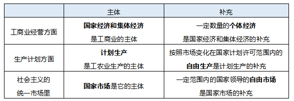 陈云提出的“三个主体、三个补充”的设想,可以结合下表理解、记忆。