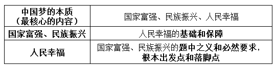 本题可从“最核心的内容”入手。中国梦的本质及其相互关系详见下表: