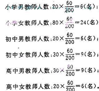 要在200名教师的学校系统中访问60名教师。在这个系统中,有100名小学教师(男20人、女80人);有50名初中教师(男20人、女30人);有50名高中教师(男30人、女20人)。请问在6类教师中各抽取多少名?