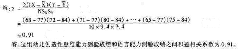 某组幼儿在创造性思维能力与语言能力测验中成绩如下,列出公式并计算两种成绩之间的积差相关系数(保留两位小数)。