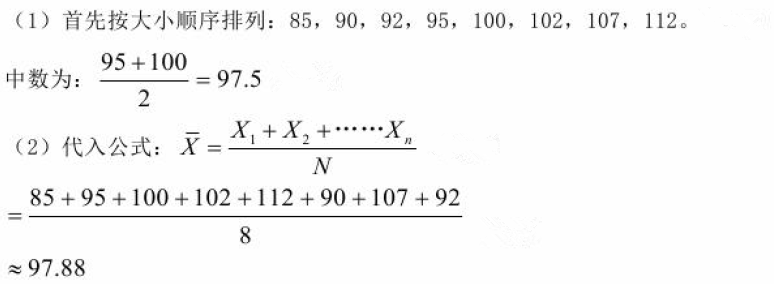 某小班8名儿童的身高分别是85,95,100,102,112,90,107,92(单位:cm),写出这组数字的中数和平均数(保留两位小数)。