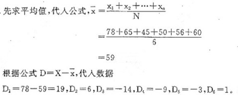 某大班六位小朋友跳绳的成绩(个数)分别为:78,65,45,50,56,60。求他们各自的离差。