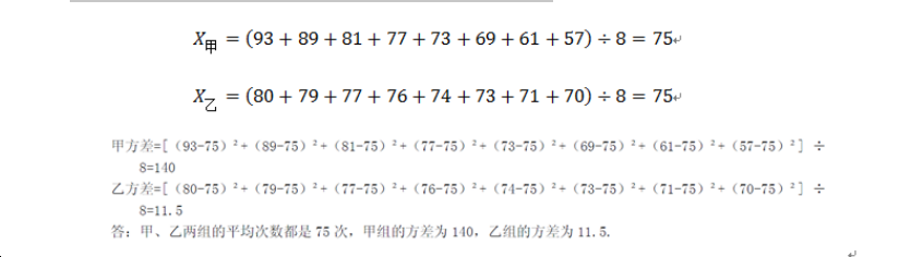 甲、乙两组各有8名低龄儿童参加比赛拍皮球游戏。10分钟后,甲组儿童拍皮球次数分别为93、89、81、77、73、69、61、57;乙组的次数分别为80、79、77、76、74、73、71、70。问两组的平均次数和方差是多少?
