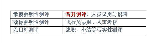 人员素质测评的类型按不同的标准有不同的划分。按测评标准划分,有无目标测评、常模参照性测评与效标参照性测评。晋升测评一般属常模参照性测评,人员录用与招聘也多属这种测评。飞行员录用与人事考核则主要属于效标参照性测评。述职、小结等写实性测评则属于无目标测评形式。故本题选A。