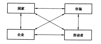 企业、劳动者、国家、市场这四个市场经济运行主体(即四个要素)之间,两两之间相互作用,存在着六对关系,如图: