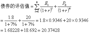 本题考点上市债券的评估。已经支付四年利息,第五年利息和本金一并支付,每年的利息额=20×9%=1.8(万元),第四年末时点计算债券的价值具体公式如下: