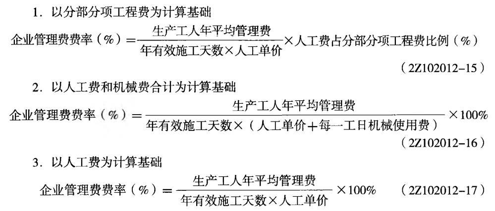 企业管理费费率的计算,只有三种情况:(1)以分部分项工程费为计算基础;(2)以人工费和机械费合计为计算基础;(3)以人工费为计算基础。 其计算的公式分别如下: