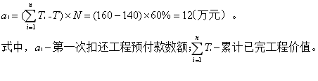 合约约定预付工程款从未完施工工程尚需的主要材料及构件的价值相当于工程预付款数额时起扣,则应从每次中间结算工程价款,至竣工之前全部扣清。起扣点的计算公式:T=P-M/N=200一36/60%=140(万元),则从第4个月开始扣除预付款,累计完成工程价值为4×40=160(万元)。第一次扣还工程预付款数额的计算公式: