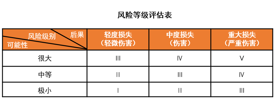根据对危险源的识别,评估危险源造成风险的可能性和损失大小,对风险进行分级。《职业健康安全管理体系实施指南》GB/T 28002—2011推荐的简单的风险等级评估见表见下图,结果分为Ⅰ、Ⅱ、Ⅲ、Ⅳ、Ⅴ五个风险等级。通过评估,可对不同等级的风险采取相应的风险控制措施。