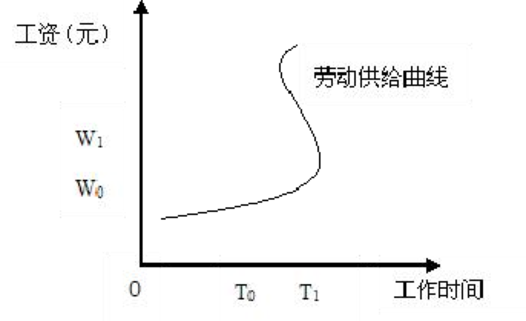 表示的是一条典型的向后弯曲的个人劳动供给曲线。当工资从W0 上升到 Wl 时,工作时数随工资的增加而增加。但当工资上升到 W1 后,工资的增加将造成劳动供给的下降。对于不同的消费者来说,Wl 点是不同的。至于某个消费者的劳动供给曲线会在什么样的工资水平下向后弯曲,取决于每个消费者的偏好。但每一个人的劳动供给曲线最终都将为负斜率,即向后弯曲,这几乎是不可避免的。不管他对物品有多么强烈的偏好,一定会有某一个较高的工资水平,在这时他可能比现在工作少些,但仍能以奢华的方式消费。