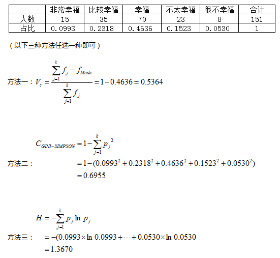 一次问卷调查中,要求被试人对“你是否幸福”从设计好的回答中选择一个:非常幸福,比较幸福,幸福,不太幸福,很不幸福,问卷汇总后得到15个人选择“非常幸福”,35个人选择 “比较幸福”,70个人选择“幸福”,23个人选择“不太幸福”,8个人选择“很不幸福”。要求: 通过计算分析回答的变异程度。