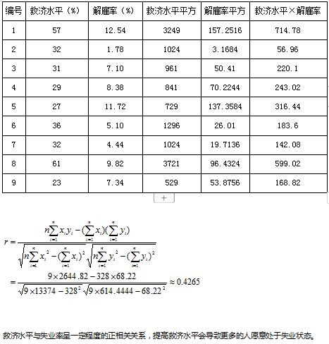 经济学家经常担心,失业救济措施可能会使商业循环衰退时期被临时解雇的人数发生扭曲,其中一个基本猜测是:失业救济将会使公司裁减更多的雇佣人员。为验证这一猜测是否成立,收集的一组样本资料列示于下表。要求:通过计算说明救济水平与解雇率之间的相关性。
