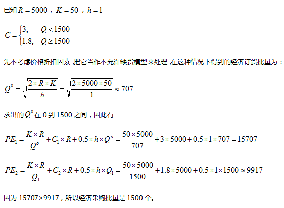某公司每年需要使用精密电子元件5000个,每次订货费50元,存储费每个1元,购买量不足1500个,每个需要3元;达到或超过1500个,享受折扣优惠,优惠之后每个1.8元。试求经济采购批量是多少。