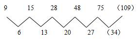前后数字作差可得公差为7的等差数列,由此可推出75和括号中的数字之差为34,括号中的数字为109。